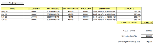 X1 LTD’ sold goods to A Ltd for £1000,860K. These goods were purchased for £550K by X1 Ltd leading to unrealised profits of £450k at Group level.