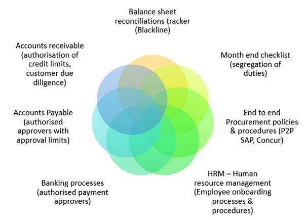 Generally, the Internal Auditors are involved in analysing Company’s internal control procedures to ensure whether they have segregation of duties in place e.g. a bank reconciliation is prepared by a bookkeeping person & is reviewed by a Finance Manager (first tier review) & finally by the HOD – head of department (2nd tier review).